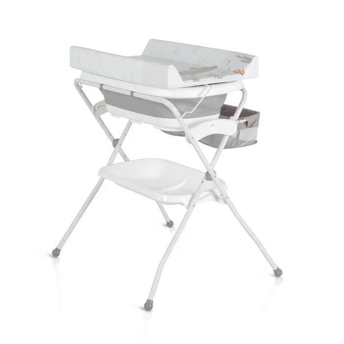 The changing mat is equipped with a waterproof material and a graduated scale in centimeters to help you monitor your baby’s growth. The bathtub includes a foldable side compartment for storing accessories and a practical drainage hose with a plug, allowing effortless water drainage in both wet and dry rooms.