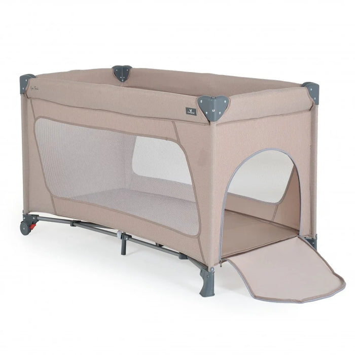 The folding cot One touch stands out with its extremely easy and quick one-handed folding method. The mechanism is specially designed for the convenience of parents. For the production of this model, high-quality fabric with a sophisticated pattern was used, which fits any interior. The playpen has 2 wheels with stoppers, a zipper entrance, a mattress with thickness 1.5 cm and a carry bag.