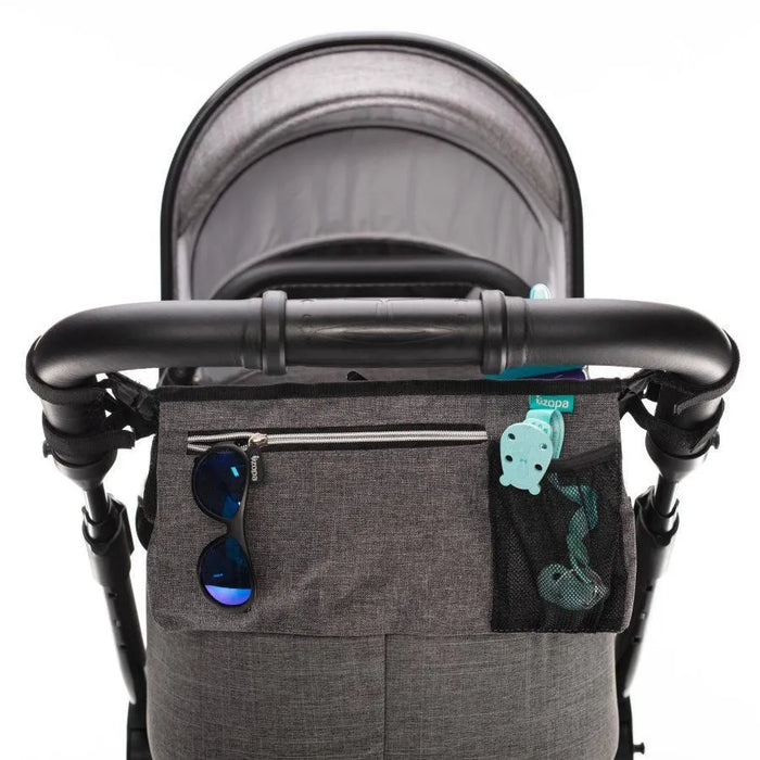 The practical and clear stroller organizer is ideal for walks with your baby. The front part of the organizer contains a large zippered pocket for small items that mom might need during a walk. There is also a mesh mobile phone pocket on the front, so mum always has an overview of what's going on with her phone despite it being on silent mode. The baby won't wake up. In the middle part there is a large zipped pocket for storing the necessary things. It has two drink holders on the sides.