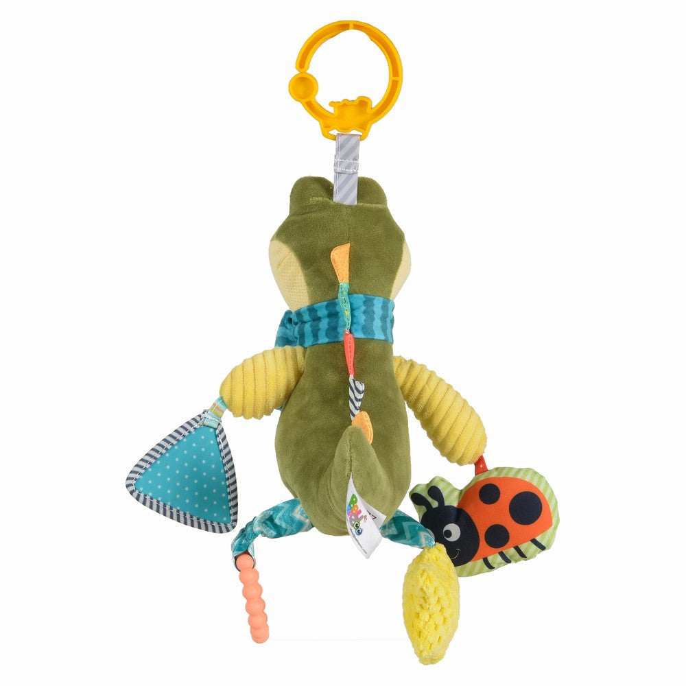 Baby plush dinosaur toy with pleasant colors and attention to detail. There is a built-in bell in the dinosaur; rustling, squeaking, silicone details, a mirror; different textures to the touch.