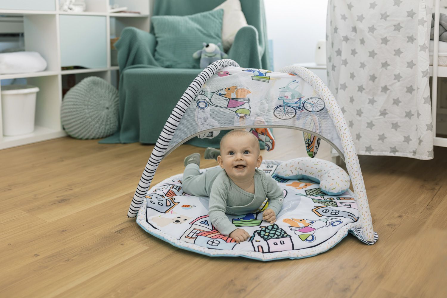 The mat includes a shaped support cushion, perfect for tummy time and early crawling training.