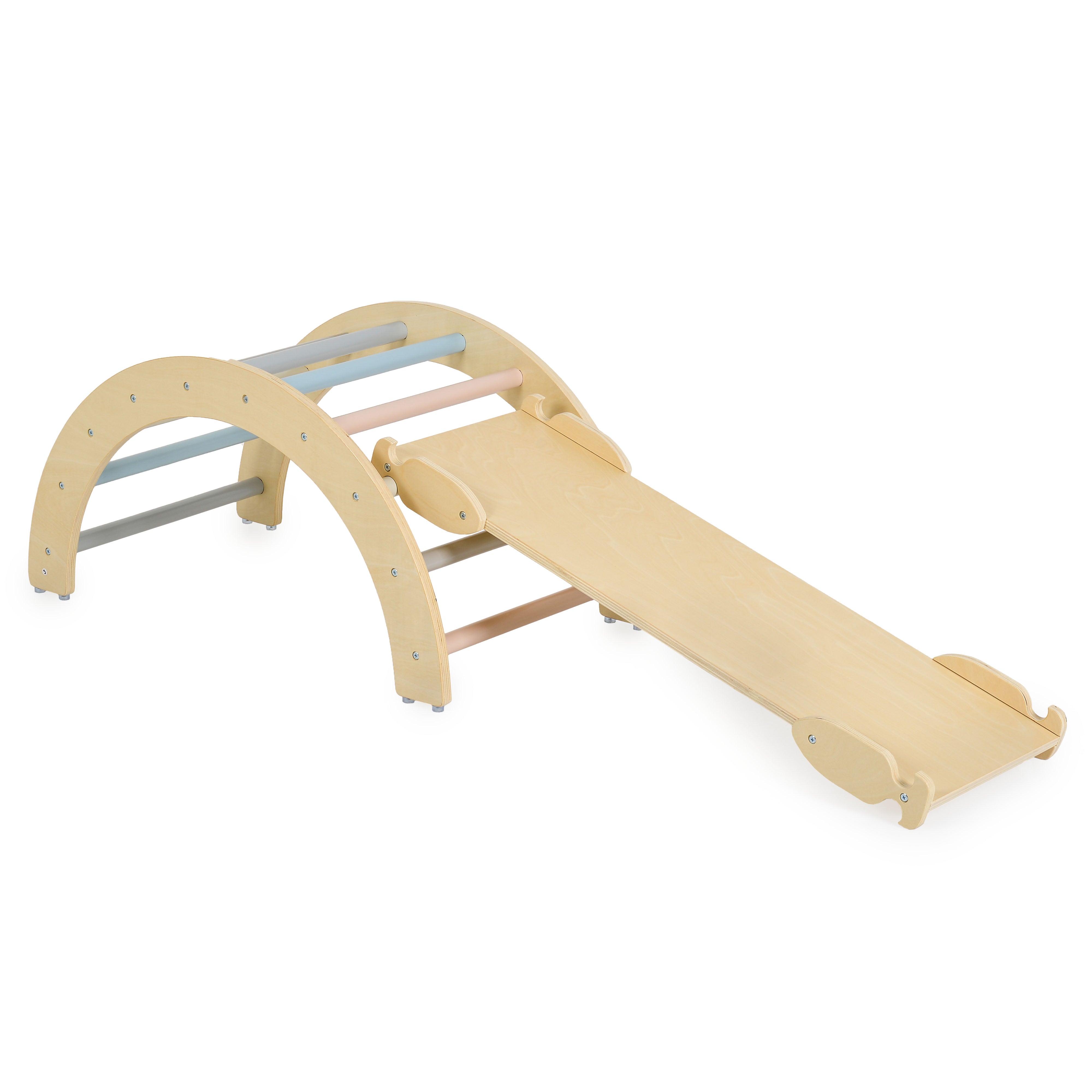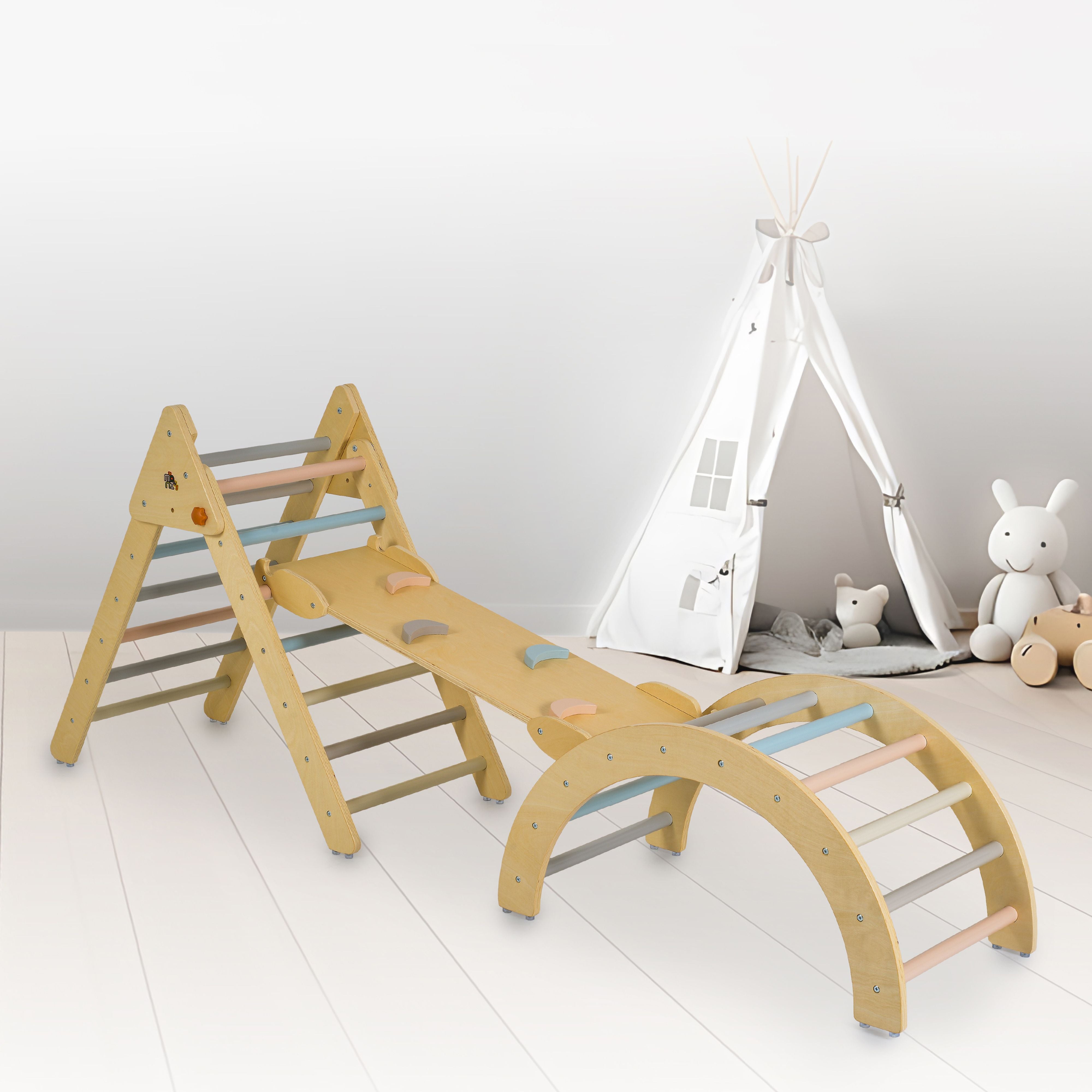 The set includes three elements – a Pikler triangle, a rocking/climbing arch, and a double-sided ramp – all of which can be used individually or combined in countless configurations to create exciting play setups.