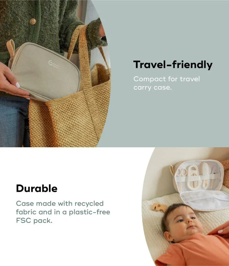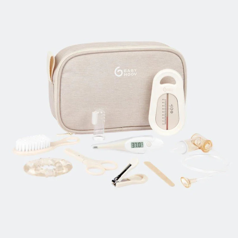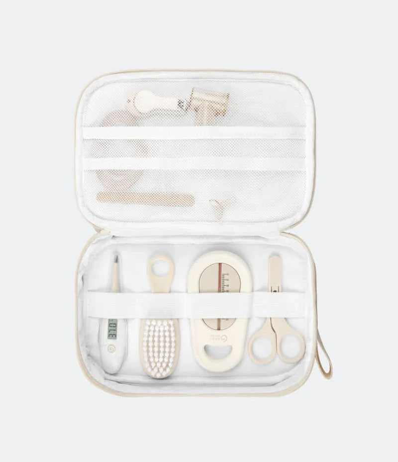 Στο εσωτερικό θα βρείτε λίμα νυχιών, ασφαλή ψαλιδάκια νυχιών, ρινικό αναρροφητήρα με στόμιο (με συλλογή βλέννας σε κλειστό θάλαμο), μασητικό οδοντοφυΐας, βούρτσα μαλλιών, οδοντόβουρτσα, θερμόμετρο μπάνιου, ορθικό θερμόμετρο και ψαλίδι με στρογγυλεμένες άκρες. Κάθε αντικείμενο φυλάσσεται με ασφάλεια μέσα σε μία θήκη από ανακυκλωμένο ύφασμα σε χρώμα άμμου με δίχτυα και ελαστικές θηλιές, για εύκολη οργάνωση και πρόσβαση.