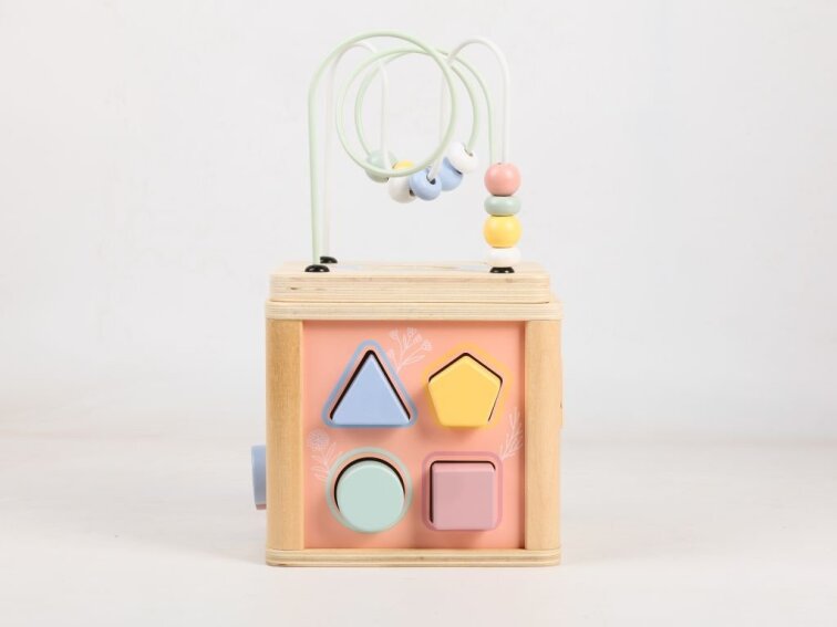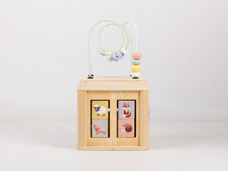 The activity cube features a variety of interactive components designed to promote learning through play. Children can spin the cogs, move beads along the wire maze, rotate picture panels with animal illustrations, or match the correct shapes to the corresponding slots.