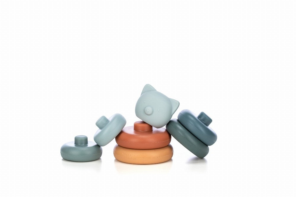 The set contains 7 different silicone building blocks that can be put on top of each other. Each building block is of different colour and size. For easier stacking and more fun, the building blocks are convex. A teddy bear head is put on top of the assembled tower, which makes the tower particularly interesting and attractive for the child.