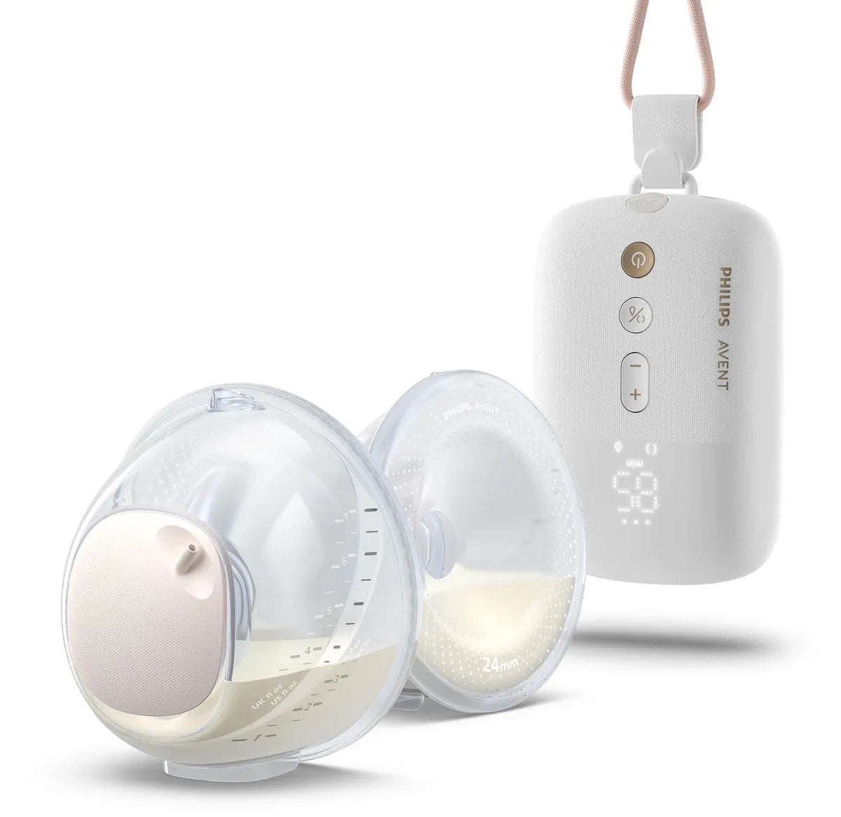 Hands Free Double Breast Pump. Developed with hospital grade power, includes exclusive SkinSense silicone cushions, 2 light and transparent pumping cups. Includes nipple measuring card, 2 x 21/24 mm cushions and 2 x 19 mm nipple shields,